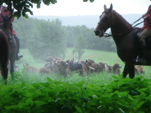 Nach meheren Jagden in Alsting bei bestem Wetter war dieses Mal Regen angesagt, es regnete nur einmal - von morgens bis abends. Passionierte Jagdreiter schreckt das nicht ab, sodaß President Claude Monnet, nach dem ausgiebigen französischem Frühstück, 22 Reiter im Feld begrüßen konnte. Die Parforcehornbläser St. Georg Saarbrücken begleiteten die Jagdgesellschaft auf allen Schleppen musikalisch.