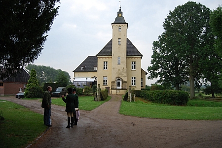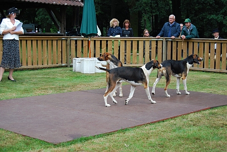 Wir ließen die Hunde nochmal ausgiebig im weitlaüfigen Gelände spazieren gehen, bevor sie im Meutetransporter übernachteten und bewunderten dabei die vielen festen Hindernisse im Wald und auf der großen Wiese neben dem Prüfungsgelände.Die Hunde waren von Andrea vorbildlich trainiert worden und ließen sich wunderbar an der Leine führen. Am Abend traf man sich zum gemeinsamen Essen und Erfahrungsaustausch im Schloss, das als Clubhaus genutzt wird. Hier gab es ein Wiedersehen mit den Freunden der anderen Meuten. Alexandra und Axel Hoch waren ebenfalls den weiten Weg gefahren und hatten Ludwig Dietrich von der Frankenmeute mitgebracht.