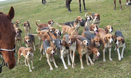 Am Freitagnachmittag trudelten die Teilnehmer gegen 16.00 Uhr nacheinander ein. Es gab dann sogleich Kaffee, Kuchen und wer mochte ein Glas Sekt, um sich auf das bevorstehende Wochenende einzustimmen. Um 17.00 Uhr wurde gesattelt, um die ersten Schleppen mit der Meute zu reiten. Die Hunde waren sehr aufgeregt nach der langen Winterpause und die neuen Hunde fügten sich nach zögerlichem Anlauf gut ein. Zwerg entdeckte nach der ersten Schleppe ein Reh, ließ aber kurz danach davon ab und kam darauf zur Meute zurück. Die restlichen drei Schleppen verliefen für Jung- und Neuhunde gut.