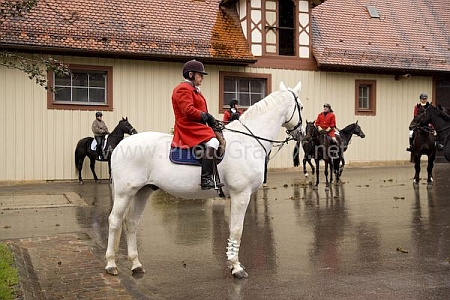 Saturday morning started with a tour of Marbach stud which was very interesting, and something completely different to what either of us had previously experienced; very enjoyable and fascinating. Then it was time to get the horses ready, which came as a shock, particularly for John who always has his horse groomed and tacked, ready to go; when hunting in England. After disassembling the language barrier, a gentleman’s agreement was established; John’s horse was prepared. In England, it is traditional for the horse to be groomed for a rider. It was soon time for the meet; we entered the stud to