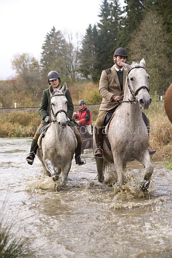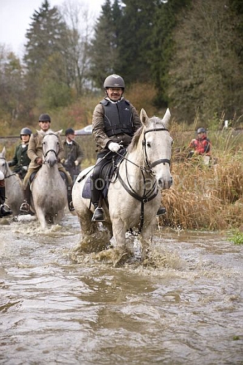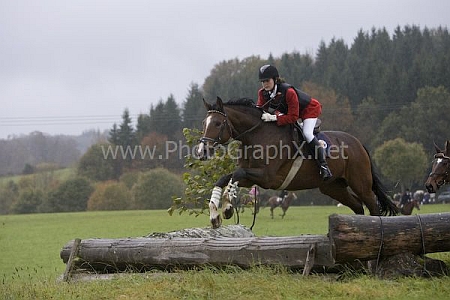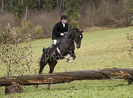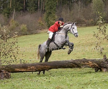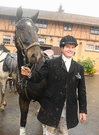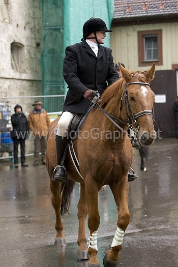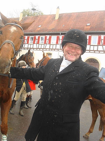 Auf Drängen von Friederike Mönch nahm ich am 17.10.09 im HuL Marbach an meiner ersten Jagd teil. Da ich totales Neuland betreten wollte, war ich sehr nervös. Und da Friederikes und mein Pferd während der Anfahrt nicht so harmonierten und wir noch umladen mussten, kam es mir wie ein schlechtes Ohmen vor, da auch noch das Wetter nicht so toll war und es dauernd regnete. Als Stärkung gab es zum Stelldichein Hefezopf, Schnaps und Sekt. Unter leichtem Nieselregen, der zum Glück nach lies und aufhörte, holten wir unsere Pferde und wurden vom Jagdherrn Dr. Dieter Förschler begrüßt. Dann hieß es auf zur Jagd. Mein Pferd war sehr nervös, da es für uns beide die erste Jagd war und die vielen Pferde und Hunde ungewohnt waren. Doch mein Pferd hat sich als begeistertes Jagdpferd herausgestellt. Sie machte super mit und so machte die Jagd riesigen Spaß. Die Pause kam sehr schnell und die Reiter und Zuschauer wurden mit Schmalzbrot, Laugenweckle, Pfefferbeißer und Getränken gestärkt. Der Boden hat auch nach der Unterbrechung super gehalten und das Wetter auch. Verwundert haben mich die vielen Fotografen, die trotz des schlechten Wetters fleißig Fotos machten – ob das wohl immer so ist? Auch die Jagdbläser hielten bei den schlechten Verhältnissen durch. Die Schleppen waren super gelegt und die Hindernisse den Wetterverhältnissen angepasst und trotz manchem übermütigen Reiter ist nichts Schlimmes passiert. Ausgeklungen ist die Jagd für die Hunde mit Pansen und für die Reiter mit Bruch und Meuteknopf. Für mich war meine erste Jagd ein voller Erfolg. Nur beim nächsten Mal sollt ich meine Stollen besser reindrehen, da ich die Hälfte verloren hab. Was mich nicht an einer Wiederholung hindern wird. Berichterstatterin: Isabel Wacker ![]() |