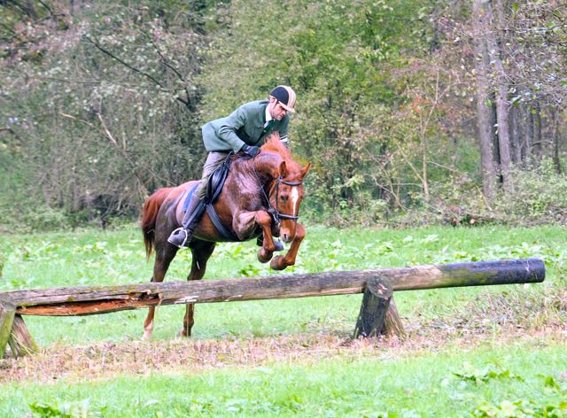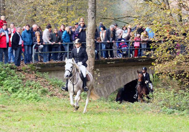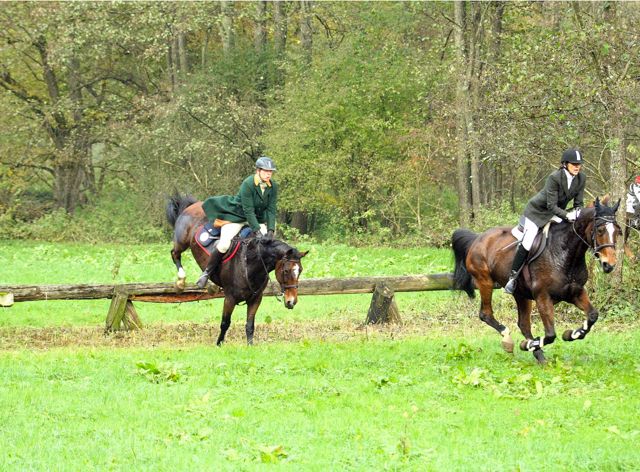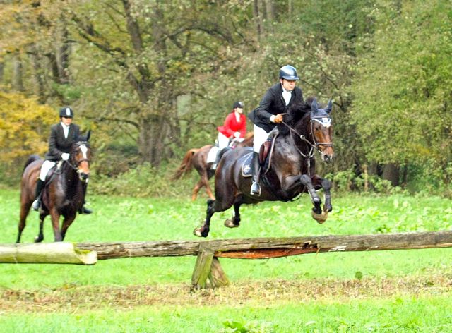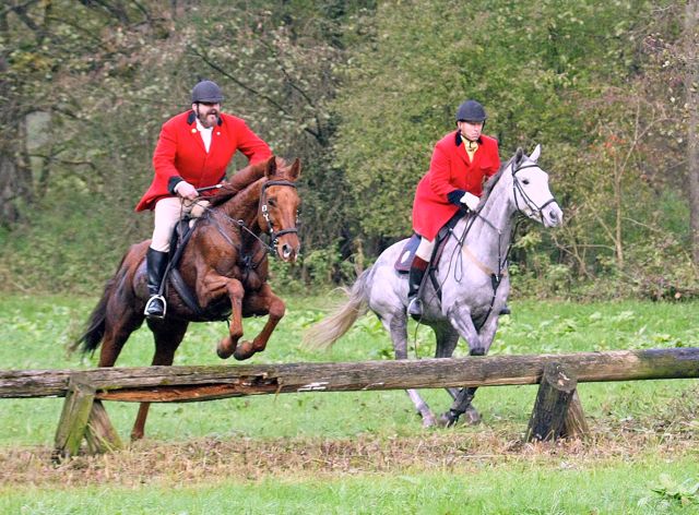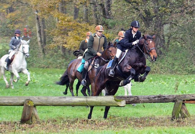 | Jagdbericht Friedrichsruhe Eine Reise ist Friedrichsruhe immer wert, also auch dieses Jahr. Anreise am Sonntag, sonst ist es doch etwas weit, und dann am Montag auf zur Jagd. Diesmal mit meinem neuen Pferd, mal schauen, wie‘s geht, es ist erst unsere zweite gemeinsame Schleppjagd. Kaiserwetter, wie bestellt und schon geht’s los, über den Golfplatz und in Richtung der ersten Schleppe. Und dann laufen die Hunde los, schnell und spurtreu wie immer. Meine Stute braucht noch etwas Aufmunterung, so schnell ist sie noch nicht gewohnt. Nach einem etwas abrupten Stopp wartet schon bald der erste Schnaps auf uns und dann schlittern wir den Wald runter ins Sal-Tal zur schönsten Schleppe dieser Jagd. Den Bach entlang immer wieder einladende Baumstämme und x Bachdurchquerungen (ich hatte keine Zeit zum zählen). Ines bekommt Spass an der Sache und startet durch. Was für eine Jagd (und was für ein geniales Pferd), wir kommen atemlos zum Zwischenhalt, den letzten Sprung scheint mir doch etwas hoch, ich lass ihn rechts liegen. Beim näheren Betrachten wäre er doch ganz nett gewesen, aber wir sind schon dran vorbei. Zum Essen bin ich viel zu nervös, ich lasse mein Pferd etwas grasen und kann’s kaum erwarten, weiter zu reiten. Diesmal möchte ich ganz vorne mitreiten, im Galopp durch den Bach brettern ist das Grösste. Und wieder geht’s los, ich kann mich grad hinter den Feldführern einreihen und sehe noch etwas von den Hunden (wenigstens die ersten 15 Sekunden). Nach dem berühmten Heckensprung, (den ich umritten habe, übertreiben will ich nun doch nicht), hat ein Pferd seine Reiterin verloren. Ohne Pilot springt es alle Sprünge locker weiter, die Reiterin nimmt die Verfolgung mit einem Auto auf und kann am Ende der Schleppe wieder mit ihrem Pferd vereinigt werden. Auf der letzten Schleppe wird mein Pferdchen doch etwas müde, der tiefe Boden zeigt nun Wirkung, und wir lassen's weiter hinten im Jagdfeld etwas ruhiger angehen. Und schon ist alles vorbei, rund ums Halalifeuer sieht man nur strahlende Gesichter, was für eine Jagd! Vielen Dank an die Organisatoren, es war einfach perfekt und danke an die Hunde, die uns schnell und sicher hinter der Spur führten. Ich werde Friedrichsruhe auch nächstes Jahr wieder einplanen, meine Stute hat sich super angestellt und die lange Anreise lohnt sich auf alle Fälle. Ein dreifaches Horrido aus der Schweiz, Eure Denise Locher |