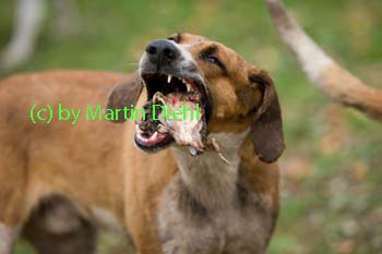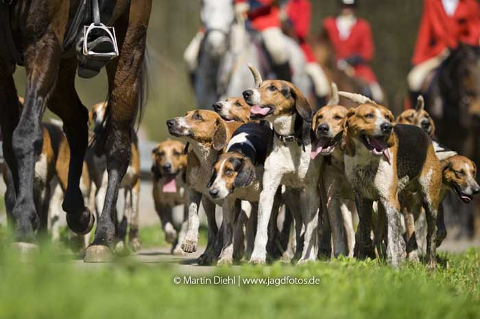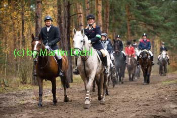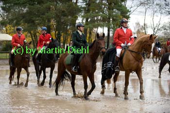 Da lacht mal wieder das (Jagd)reiterherz - die Jagd in Mannheim-Friedrichsfeld ist jedes Jahr wieder eine Gelegenheit schnell zu reiten, viele und interessant gebaute Hindernisse anzugehen und natürlich auch zu springen, den tollen Sandboden tot zu reiten oder einfach Spaß zu haben. Bei gutem Wetter kamen wir an und konnten gleich die gute Verköstigung genießen - Lachshäppchen, Wurst, Käse - alles vom Feinsten. Den Gottesdienst habe ich mir geschenkt, denn irgendwie schien Dolly, meine Stute, nicht sehr religiös zu sein oder aber den Gottesdienst mit einem Tanzball zu verwechseln - zumindest meinte sie das beim letzten Mal - stillstehen war da nicht, sondern nur Herumgehampel. Nach einigen Grußworten dann auf - schnelle Hunde - WOW! Ich hatte mich zusammen mit Bettina an das Ende der Equipage gesetzt. Wir waren - wohl wegen dieser schönen Jagd - doch zu viele Piköre. Springen ging gut, nur ein Rumpler mit Annette, aber den hat sie mir verziehen - hoffe ich. Wie immer - rechts - links - Sprung und noch einer. Dann Stopp und und schon wieder ging es auf die nächste Schleppe. Nach der Pause noch zwei lange Schleppen mit Billard, offenem Graben und schönen Sprüngen und dann waren die Runs auch schon wieder vorbei - Schade! Aber Thea hatte auf diesen letzten Runs ganz schön zu kämpfen. Ihre Arme waren doch schon ziemlich lang am Ende der Jagd. Schade war für die Zuschauer, dass sie nicht so oft bei uns waren und die Jagd begleiten konnten. Sie haben dieses Jahr nicht so viel zu sehen bekommen, denn Begleitfahrzeuge gab es dieses Mal keine. Die Hunde bekamen am Feuer ihre Curée. Der Fotograf war glücklich über so viele Schnauzen vor dem Objektiv und schoss ein Foto nach dem anderen. Man konnte diese Bilder dann bestellen. Es waren sehr schöne dabei. Danach wieder ein gutes Essen. Annette und ich hatten nach unserem Spaß beim "Gebiss-Tausch", den die meisten der Anwesenden nicht ganz so verstanden, wie es gemeint war. Zur Klärung: Es handelte sich um ein Trensengebiss und nicht um das Sharing unserer "Dritten". Tja, und dann haben Thea, Dieters Schimmel, mein Rappe und ich den Heimweg angetreten, später abends waren wir hundemüde aber oberglücklich daheim. Nächstes Jahr wieder! Horrido! Berichterstatterin: Uli Naumann |