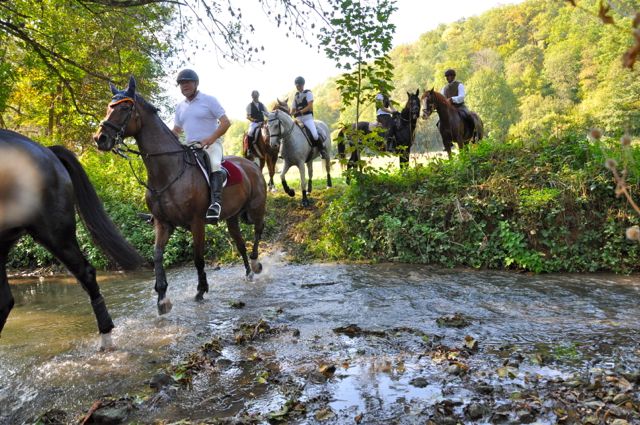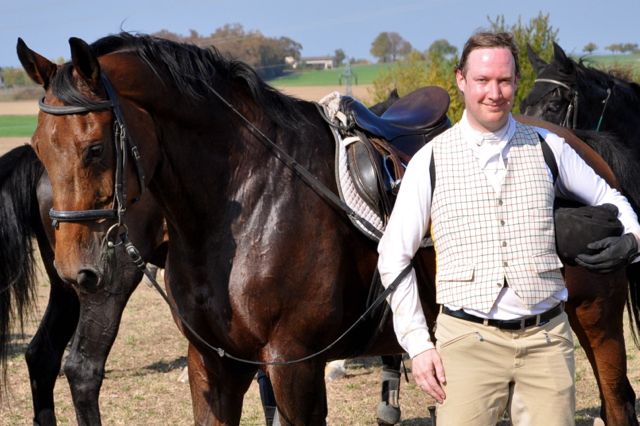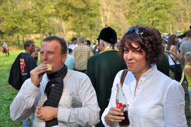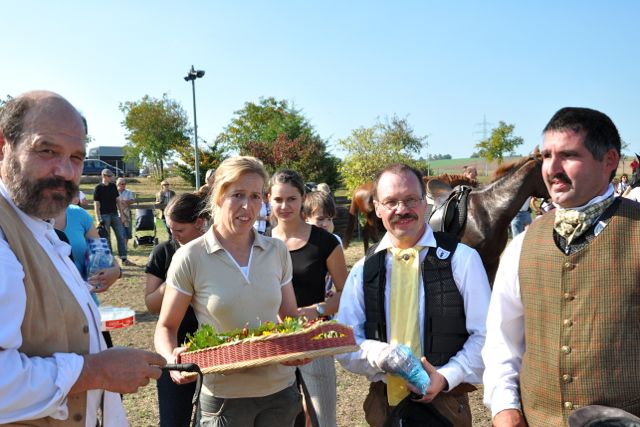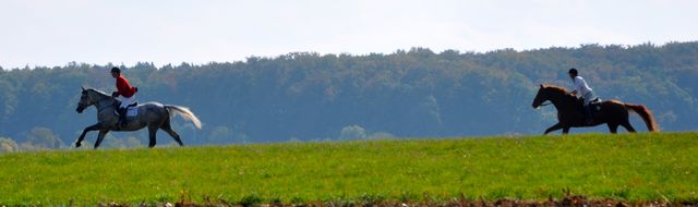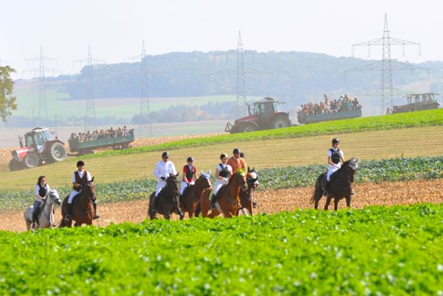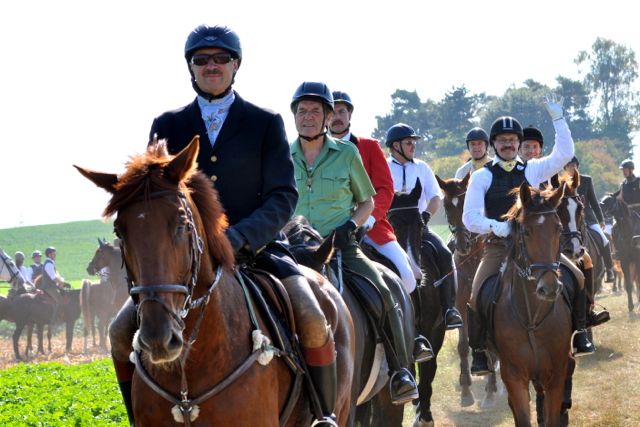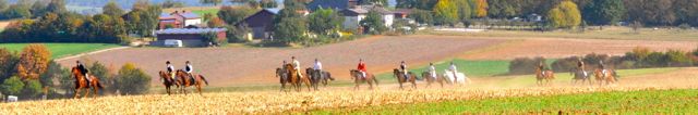 auch so gehen. Nach der Aufstellung auf dem Sandplatz am Nussdorfer Reiterzentrum spielen die Jagdhornbläser aus Heimsheim zum Aufbruch. Das Feld verlässt im Schritt die Anlage. Es sind knapp 60 Reiter dabei. „Jedes Mal werden es mehr“, sagt der Schleppenleger Daniel Rapp. „Das muss für unsere Strecke sprechen.“ Daniel Rapp ist mittlerweile in die Fußstapfen seines Vaters Immanuel Rapp getreten, der früher Trabrennen gefahren ist und unzählige Jagden organisiert hat. Die erste Schleppe folgt schnell. Im forschen Galopp geht es in Richtung Sonnenberg über hügelige Wiesen und abgemähte Maisfelder. Lehmklumpen fliegen durch die Luft. Die knochentrockenen Felder stauben mächtig. Keine guten Aussichten für Kontaktlinsenträger. Die Schleppe endet mit einem Bergab-Galopp. Am Horizont erscheint die Stadt Vaihingen. Rehe kommen aus dem Unterholz und huschen über den Acker. Aber die Hunde bleiben im Apell. Bereits jetzt pumpen Hunde, Pferde und Reiter. Die fleißigen Helfer reichen Wasser und Schnäpse. Das Jagdfeld besteht aus drei Abteilungen. Schöne Idee: Ein berittenes Beobachterfeld bringt auch Einsteigern die Faszination Jagdreiten näher. Die Zuschauer verfolgen auf Anhängern, die von Traktoren gezogen werden, das Geschehen. Und schon wünscht der Master erneut eine gute Jagd. Es geht wieder über Äcker und Wiesen. Mein Wallach Fritz, den mir die Rapps zur Verfügung gestellt haben, bollert gleichmäßig vor sich hin. Ich denke an einen Experten aus Irland, der mir mal gesagt hat: Ein Jagdpferd muss einen Kopf wie eine Lady haben und einen Hintern wie ein Koch. Fritz hat beides. Das Feld erreicht das idyllische Kreuzbachtal. Hier ist es schattiger und kühler. Es gibt Reiter, die von weit anreisen, nur um in dieser Umgebung mit ihren Pferden ins Gelände zu gehen. Die nächste Schleppe geht über endlos lange Wiesen. Am Rand fließt ein Bach. Jetzt kommen auch die ersten Hindernisse: Baumstämme in den unterschiedlichsten Varianten. Die Schleppe endet mit einem Sprung kurz vor einer Wasserstelle. Im Laufe des Tages wird es zwei Wasserdurchritte geben. Zur Pause reichen die Helfer Getränke und Fleischkäse im Brötchen. Die Heimsheimer Jagdhornbläser blasen in ihre Instrumente. Wer sein Jagdjacket noch nicht abgelegt hat, tut es jetzt. Nach einer knappen halben Stunde geht es zurück nach Nussdorf. Die Strecke führt durch den Hegwald. Dann kommen wieder die staubigen Äcker. Doch der zweite große Höhepunkt nach dem herrlichen Kreuzbachtal kommt noch: Es ist eine der wenigen noch existierenden Grasrennbahnen in Baden-Württemberg. Wenn in Nussdorf nicht gerade gejagt wird, nutzt die Familie Rapp sie auch für Bauernrennen – mit Quoten und Wetten. Die Rennbahn ist Abschluss der letzten Schleppe mit zwei weiteren Hindernissen. Die Hunde haben zwar Probleme, den richtigen Eingang zur Rennstrecke zu finden, doch irgendwann klappt es. Die Zuschauer applaudieren den Jagdreitern, die vor lauter Freude 3mal die Runde drehen. In der Mitte prasselt ein Lagerfeuer. Nach der 3. Runde ist Schluss. Halali, Halali. Die Jagdherrschaft überreicht den glücklichen und erschöpften Reitern als Andenken den Bruch. Für die Hunde gibt es 35 Kilo Rinderpansen aus der Landmetzgerei des Jagdherrn Raimund Wöhr. Die Jagd ist ein voller Erfolg: tolle Hunde, prächtiges Wetter, keine Verletzungen und Stürze und ein abwechslungsreiches Gelände, das es so kein zweites Mal gibt. Berichterstatter: Philipp Schneider, Stuttgart ![]() |