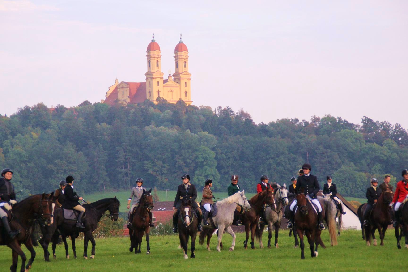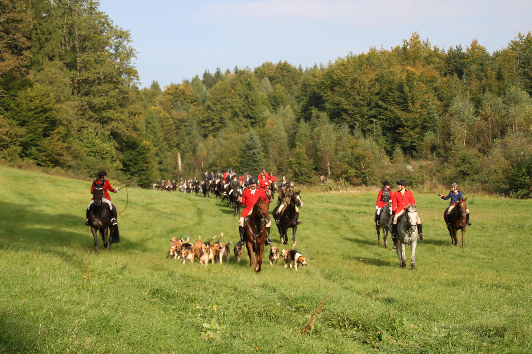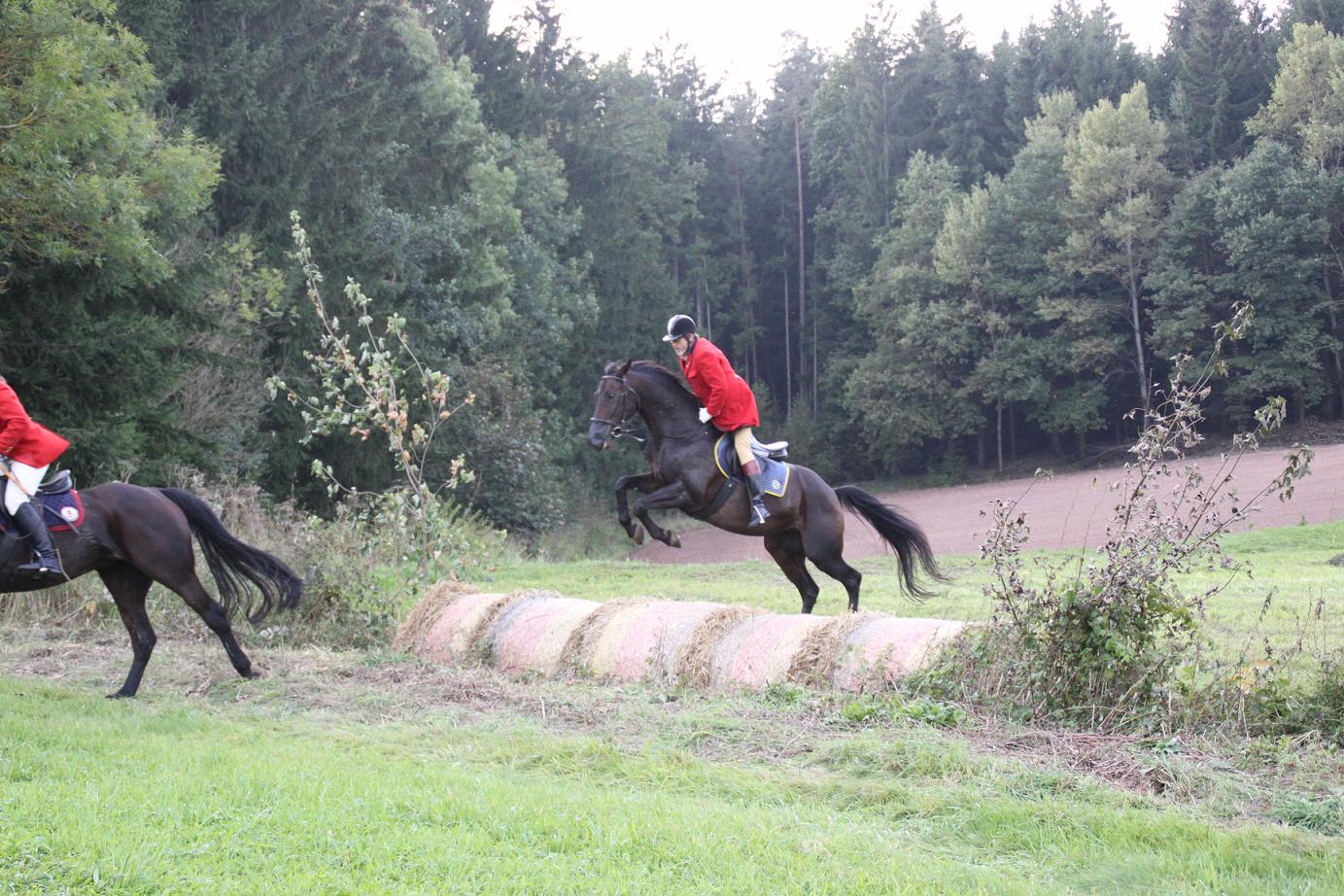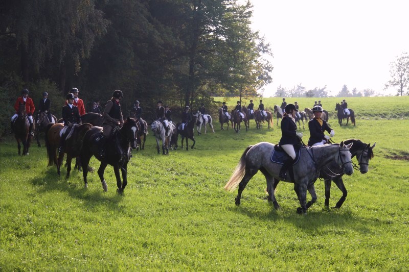 „Jagdreiten ist die Krone und der Gipfel der reiterlichen Betätigung im Gelände“, schreibt Waldemar Seunig in seinem Standardwerk „Von der Koppel bis zur Kapriole“. So versammeln sich dann auch über 75 Reiter bei strahlendem Herbstwetter im Innenhof des Schlosses Ob Ellwangen zur 11. Ellwanger Schleppjagd. Es ist ein Rekord, so viele Teilnehmer hatte die Jagd noch nie. Nach einem Umtrunk spielen die reiterlichen Jagdhornbläser Ellwangen unter der Leitung von Monika Willand, die an diesem Tag ihren 76. Geburtstag feiert, zum Aufbruch. Geritten wird in drei Feldern. Für die jugendlichen und unerfahreneren Reiter gibt es ein Beobachtungsfeld. Die Jagd führt in einem Rundkurs um die Wallfahrtskirche Schönenberg, die von fast jeder Schleppe aus im goldenen Septemberlicht zu sehen ist. Die Reiter verlassen das Schloss durch den alten Wassergraben, und die erste Schleppe folgt schnell. Im rasanten Galopp folgen die Reiter den schnellen und spurtreuen Hunden, die vom Master Gerd Klapschus und seiner Equipage sicher geführt werden. Die Zuschauer verfolgen das Geschehen auf drei Anhängern, die von Traktoren gezogen werden. Weiter geht es nach einem kurzen Stopp durch das Holbachtal, wo fünf jagdgerecht gebaute Hindernisse zu überwinden sind, zur Rast bei Kalkhöfe mit einem reichhaltigen Büffet. Von dort geht es gleich weiter auf die nächste Schleppe entlang der Jagst mit zwei Hindernissen und sodann Richtung Rindelbach, wo drei Sprünge zu nehmen sind, unter anderem ein Strohballenhindernis nach einem Bergabgalopp und ein Aufsprung. Danach dürfen sich die Hunde in der Jagst abkühlen, dann reiten wir vorbei an der alten Jagstbrücke auf die letzte Schleppe, mit zwei Baumstammhindernissen, zum Halali und Curée an der Rinderburg. Oberbürgermeister Hilsenbeck, der Schirmherr der Jagd, begrüßt die glücklichen und erhitzten Reiter. Die Pferde dampfen, die Hunde erhalten den wohlverdienten Pansen und die Reiter ihren Schnaps und die Brüche. Eine tolle Jagd mit ein paar harmlosen Stürzen, die glimpflich ausgehen, geht zu Ende. Dank Eddy Schusters Gastfreundschaft, er ist einer der Jagdherren, hat auch unser Pferd ein Nachtquartier in Ellwangen gefunden und wir können die Jagd bei einem zünftigen Essen und netten Gesprächen unter Jagdreiterfreunden im Barbarossakeller ausklingen lassen. Nach einem umfangreichen Frühstück im Reiterstüble fahren wir am Sonntag glücklich aber erschöpft nach Stuttgart zurück. Jagdbericht von Katja Grimm ![]() Ellwanger Schleppjagd ist ein Naturerlebnis pur Schöne Rösser und stolze Reiter in großartiger Landschaft – Mehr Teilnehmer als je zuvor Von Petra Rapp-Neumann, Ipf und Jagst Zeitung Was für ein Schauspiel. Pferdeleib an Pferdeleib, schnaubende Nüstern, schmucke rote Röcke, aufgeregt bellende Hunde, in der frühherbstlichen Luft eine aromatische, fast animalische Mischung von Sherry, mit dem die Reiter begrüßt werden, und Rossäpfeln – es ist Ende September und damit wieder Zeit für die vom Reitverein Rindelbach veranstaltete und bestens organisierte Schleppjagd. Im Innenhof des Ellwanger Schlosses drängen sich 73 stolze Reiter – ein Rekord, so viele Teilnehmer gab es noch nie bei einer Schleppjagd, die in der Pferdestadt Ellwangen lange Tradition hat. Auch in diesem Jahr können Zuschauer die Jagdstrecke geführt in Planwagen begleiten. Geritten wird in drei Feldern einmal rund um den Schönenberg. Das dritte Feld ist für weniger geübte Reiter. Schon rufen die Signale der Reiterlichen Jagdhornbläser unter Monika Willands Leitung zum Aufbruch, dreimal ein kräftiges „Horrido“, dann verlassen Rösser und Reiter unter Hufgetrappel das Schloss. In die drei Planwagen passt beim besten Willen niemand mehr hinein, die Traktoren ziehen an, und los geht’s über Stock, Stein und den Schlossgraben. Die Schleppjagd wird zum 11. Mal hinter der Hardtmeute des Badischen Schleppjagdvereins geritten. Die Hunde haben die Spur der Schleppenleger aufgenommen, das erste Reiterfeld ist schon am Horizont verschwunden. Die Strecke mit sorgfältig präparierten Hindernissen ist rund 15 Kilometer lang. Auf einer Wiese bei Holbach knickt ein Pferd an einem Graben ein, die junge Reiterin kann sich nicht mehr im Sattel halten, beide kommen mit dem Schrecken davon. Über den Hofforstquerweg zuckeln die Planwagen durch den dunklen Tann in Richtung Kalkhöfe, wo Reiter, Pferde, Jagdhornbläser und Zuschauer zünftig im Grünen vespern. Gestärkt geht die wilde Jagd weiter und nähert sich bereits ihrem Ende, als plötzlich ein Pferd ohne Reiter am Planwagen vorbei galoppiert. Nichts passiert, erfahren wir später und sind sehr erleichtert. An der Rinderburg versammelt sich die Jagdgesellschaft zum Curée. Die Hunde fetzen sich um den frischen Rinderpansen, ihren symbolischen Anteil an der Jagdbeute. Oberbürgermeister Karl Hilsenbek, erneut Schirmherr der Schleppjagd, begrüßt die Jagdgesellschaft, freut sich über den Teilnehmerrekord, gratuliert Monika Willand zum Geburtstag und schenkt ihr – Ellwanger Rossäpfel. Ein letztes Halali, ein Schnapserl auf die geglückte Jagd, dann ist die 14. Ellwanger Schleppjagd Geschichte und wird als unvergessliches Erlebnis in Erinnerung bleiben. ![]() ![]() ![]() ![]() Mit der Hardt-Meute auf Jagd Schleppjagd des RFV Rindelbach und der Reiterlichen Jagdhornbläser verbucht Teilnehmerrekord Von FRANZ RATHGEB, © Schwäbische Post 30.09.2013 Nach einer längeren Pause wurde vor zehn Jahren in Ellwangen erstmals wieder eine Schleppjagd veranstaltet. Am Wochenende ging nun die elfte vom RFV Rindelbach und den Reiterlichen Jagdhornbläsern organisierte Jagd über die Bühne. Angeführt von der Hardt-Meute des Badischen Schleppjagdvereins, ritten heuer insgesamt 78 Reiter durch das Jagsttal. Zum Jubiläum hatte sich die stolze Zahl von 78 Reitern auf Schloss Ellwangen eingefunden. Jagdherr Magnus Lang hieß diese und die rund 100 Zuschauer willkommen. Lang dankte den Organisatoren und Helfern, dass sie 