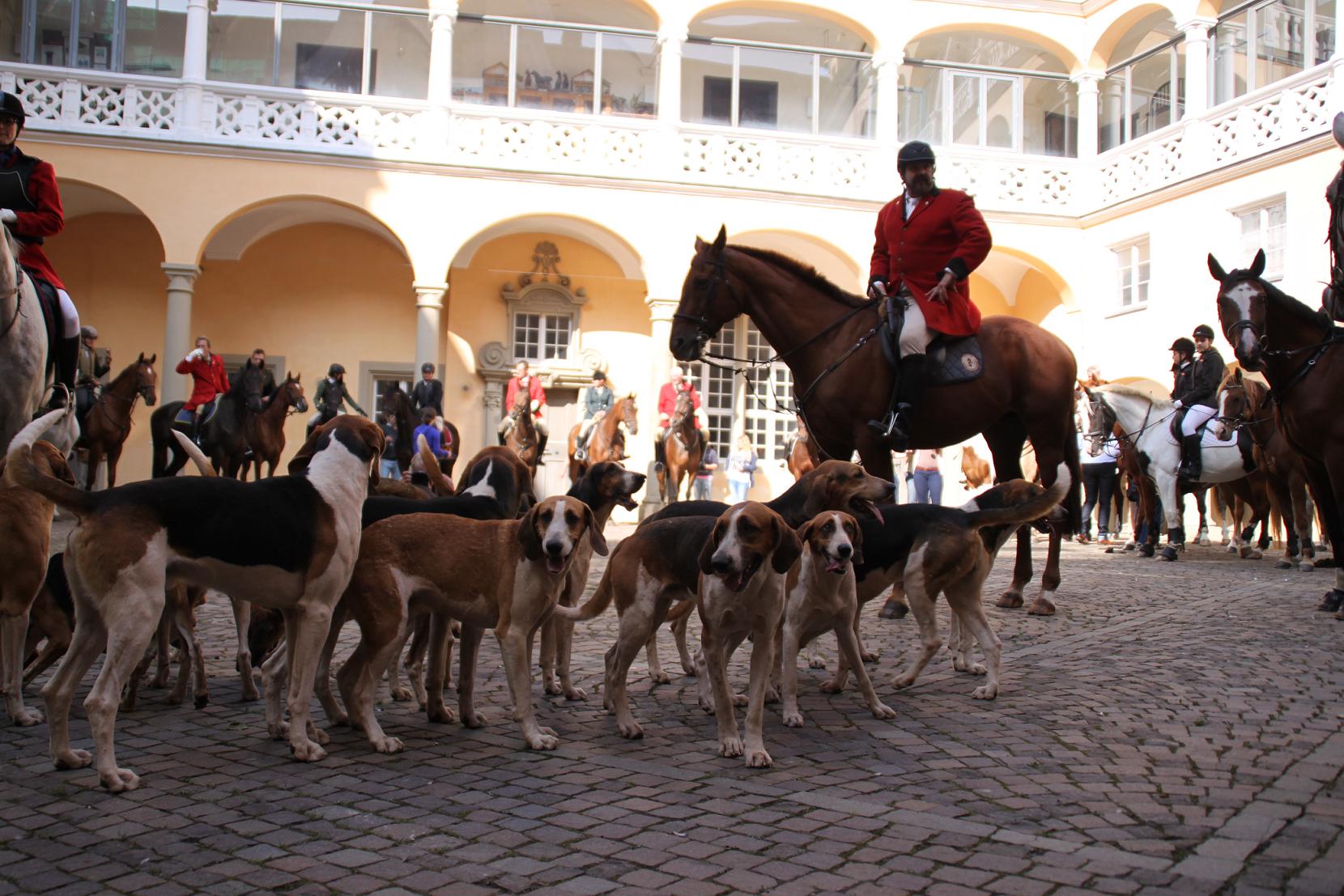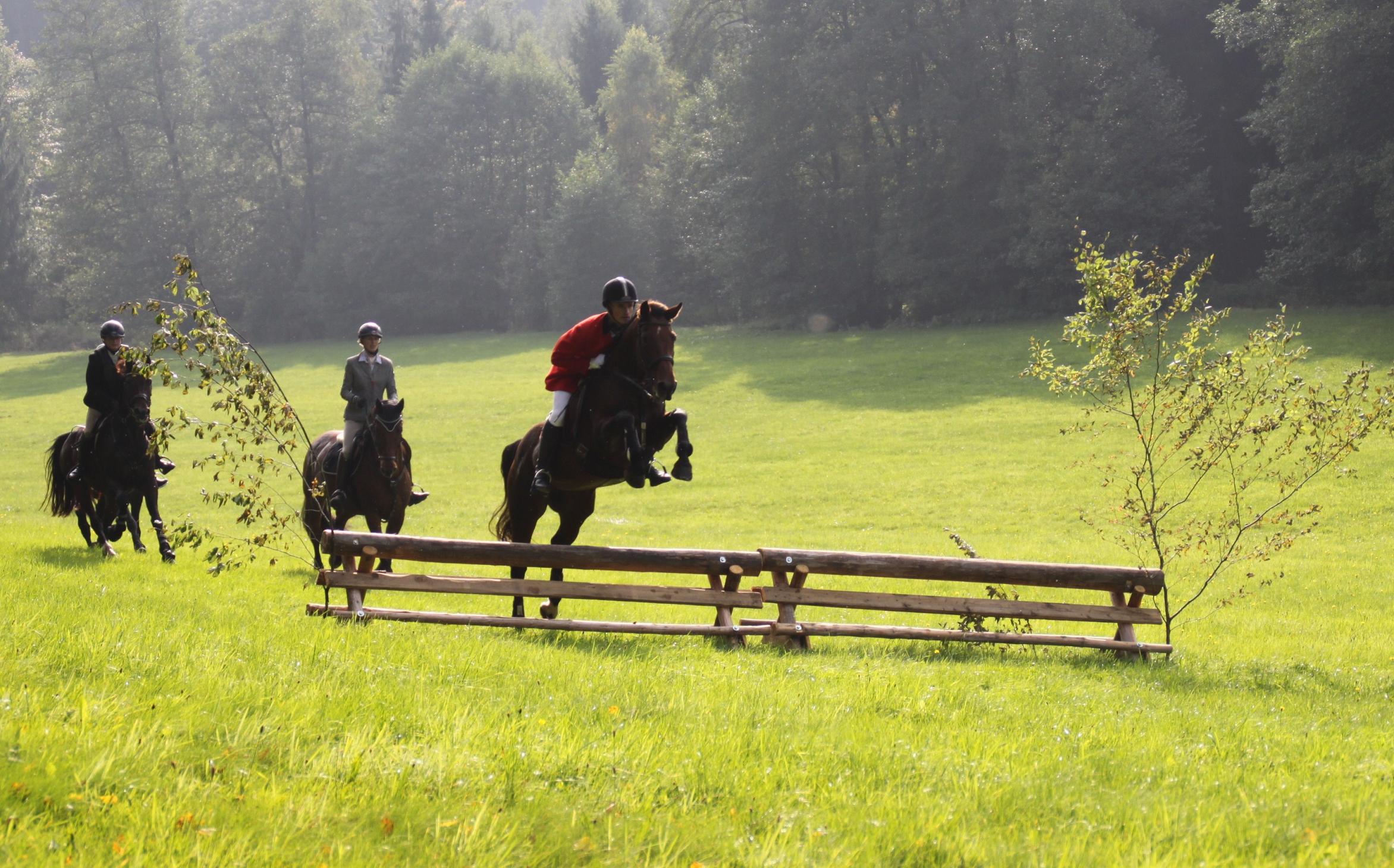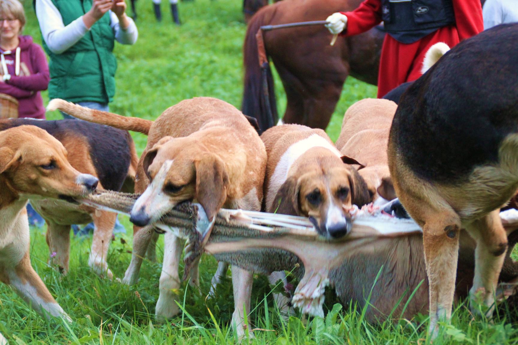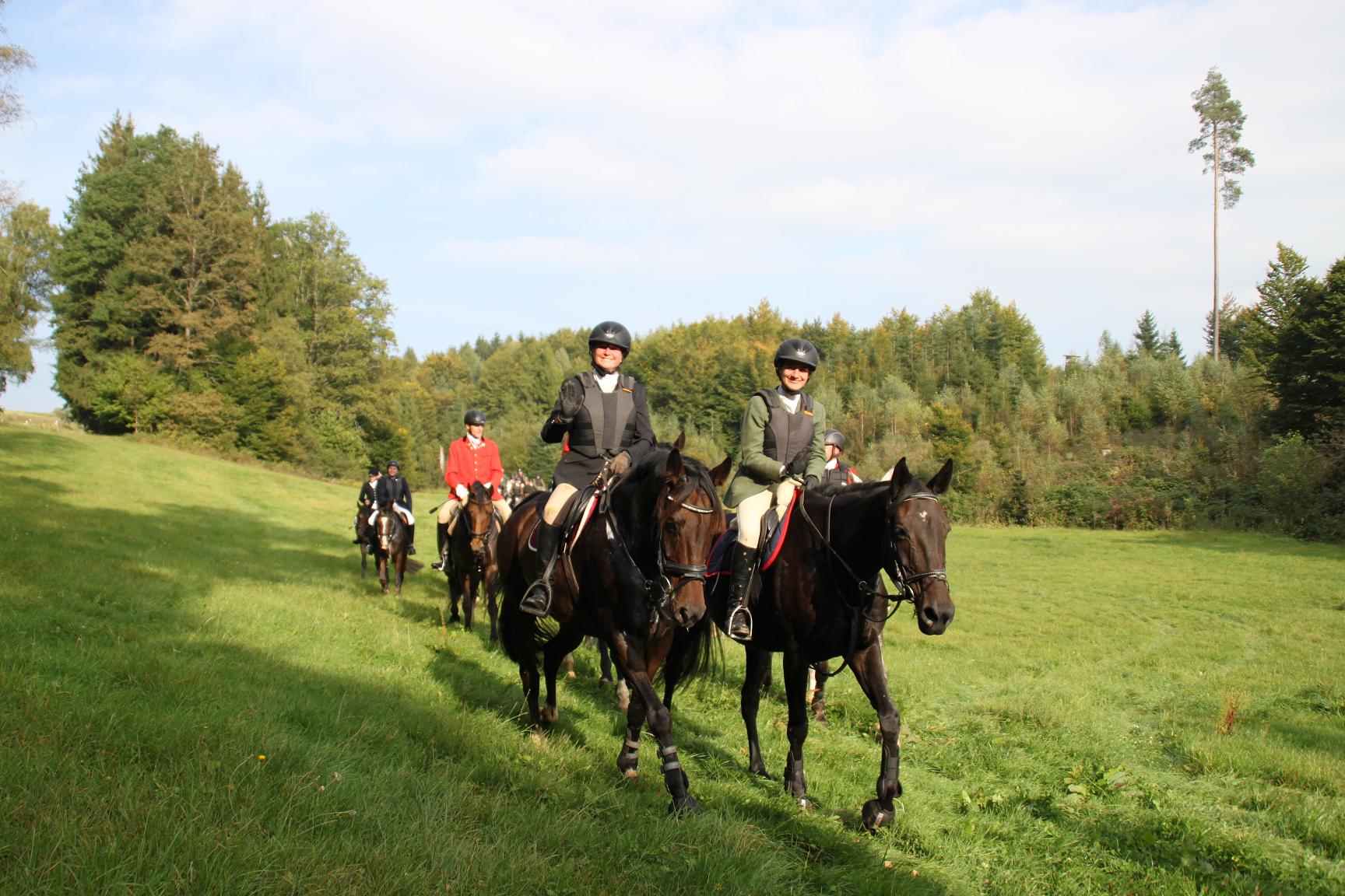 „Jagdreiten ist die Krone und der Gipfel der reiterlichen Betätigung im Gelände“, schreibt Waldemar Seunig in seinem Standardwerk „Von der Koppel bis zur Kapriole“. So versammeln sich dann auch über 75 Reiter bei strahlendem Herbstwetter im Innenhof des Schlosses Ob Ellwangen zur 11. Ellwanger Schleppjagd. Es ist ein Rekord, so viele Teilnehmer hatte die Jagd noch nie. Nach einem Umtrunk spielen die reiterlichen Jagdhornbläser Ellwangen unter der Leitung von Monika Willand, die an diesem Tag ihren 76. Geburtstag feiert, zum Aufbruch. Geritten wird in drei Feldern. Für die jugendlichen und unerfahreneren Reiter gibt es ein Beobachtungsfeld. Die Jagd führt in einem Rundkurs um die Wallfahrtskirche Schönenberg, die von fast jeder Schleppe aus im goldenen Septemberlicht zu sehen ist. Die Reiter verlassen das Schloss durch den alten Wassergraben, und die erste Schleppe folgt schnell. Im rasanten Galopp folgen die Reiter den schnellen und spurtreuen Hunden, die vom Master Gerd Klapschus und seiner Equipage sicher geführt werden. Die Zuschauer verfolgen das Geschehen auf drei Anhängern, die von Traktoren gezogen werden. Weiter geht es nach einem kurzen Stopp durch das Holbachtal, wo fünf jagdgerecht gebaute Hindernisse zu überwinden sind, zur Rast bei Kalkhöfe mit einem reichhaltigen Büffet. Von dort geht es gleich weiter auf die nächste Schleppe entlang der Jagst mit zwei Hindernissen und sodann Richtung Rindelbach, wo drei Sprünge zu nehmen sind, unter anderem ein Strohballenhindernis nach einem Bergabgalopp und ein Aufsprung. Danach dürfen sich die Hunde in der Jagst abkühlen, dann reiten wir vorbei an der alten Jagstbrücke auf die letzte Schleppe, mit zwei Baumstammhindernissen, zum Halali und Curée an der Rinderburg. Oberbürgermeister Hilsenbeck, der Schirmherr der Jagd, begrüßt die glücklichen und erhitzten Reiter. Die Pferde dampfen, die Hunde erhalten den wohlverdienten Pansen und die Reiter ihren Schnaps und die Brüche. Eine tolle Jagd mit ein paar harmlosen Stürzen, die glimpflich ausgehen, geht zu Ende. Dank Eddy Schusters Gastfreundschaft, er ist einer der Jagdherren, hat auch unser Pferd ein Nachtquartier in Ellwangen gefunden und wir können die Jagd bei einem zünftigen Essen und netten Gesprächen unter Jagdreiterfreunden im Barbarossakeller ausklingen lassen. Nach einem umfangreichen Frühstück im Reiterstüble fahren wir am Sonntag glücklich aber erschöpft nach Stuttgart zurück. Jagdbericht von Katja Grimm ![]() Ellwanger Schleppjagd ist ein Naturerlebnis pur Schöne Rösser und stolze Reiter in großartiger Landschaft – Mehr Teilnehmer als je zuvor Von Petra Rapp-Neumann, Ipf und Jagst Zeitung Was für ein Schauspiel. Pferdeleib an Pferdeleib, schnaubende Nüstern, schmucke rote Röcke, aufgeregt bellende Hunde, in der frühherbstlichen Luft eine aromatische, fast animalische Mischung von Sherry, mit dem die Reiter begrüßt werden, und Rossäpfeln – es ist Ende September und damit wieder Zeit für die vom Reitverein Rindelbach veranstaltete und bestens organisierte Schleppjagd. Im Innenhof des Ellwanger Schlosses drängen sich 73 stolze Reiter – ein Rekord, so viele Teilnehmer gab es noch nie bei einer Schleppjagd, die in der Pferdestadt Ellwangen lange Tradition hat. Auch in diesem Jahr können Zuschauer die Jagdstrecke geführt in Planwagen begleiten. Geritten wird in drei Feldern einmal rund um den Schönenberg. Das dritte Feld ist für weniger geübte Reiter. Schon rufen die Signale der Reiterlichen Jagdhornbläser unter Monika Willands Leitung zum Aufbruch, dreimal ein kräftiges „Horrido“, dann verlassen Rösser und Reiter unter Hufgetrappel das Schloss. In die drei Planwagen passt beim besten Willen niemand mehr hinein, die Traktoren ziehen an, und los geht’s über Stock, Stein und den Schlossgraben. Die Schleppjagd wird zum 11. Mal hinter der Hardtmeute des Badischen Schleppjagdvereins geritten. Die Hunde haben die Spur der Schleppenleger aufgenommen, das erste Reiterfeld ist schon am Horizont verschwunden. Die Strecke mit sorgfältig präparierten Hindernissen ist rund 15 Kilometer lang. Auf einer Wiese bei Holbach knickt ein Pferd an einem Graben ein, die junge Reiterin kann sich nicht mehr im Sattel halten, beide kommen mit dem Schrecken davon. Über den Hofforstquerweg zuckeln die Planwagen durch den dunklen Tann in Richtung Kalkhöfe, wo Reiter, Pferde, Jagdhornbläser und Zuschauer zünftig im Grünen vespern. Gestärkt geht die wilde Jagd weiter und nähert sich bereits ihrem Ende, als plötzlich ein Pferd ohne Reiter am Planwagen vorbei galoppiert. Nichts passiert, erfahren wir später und sind sehr erleichtert. An der Rinderburg versammelt sich die Jagdgesellschaft zum Curée. Die Hunde fetzen sich um den frischen Rinderpansen, ihren symbolischen Anteil an der Jagdbeute. Oberbürgermeister Karl Hilsenbek, erneut Schirmherr der Schleppjagd, begrüßt die Jagdgesellschaft, freut sich über den Teilnehmerrekord, gratuliert Monika Willand zum Geburtstag und schenkt ihr – Ellwanger Rossäpfel. Ein letztes Halali, ein Schnapserl auf die geglückte Jagd, dann ist die 14. Ellwanger Schleppjagd Geschichte und wird als unvergessliches Erlebnis in Erinnerung bleiben. ![]() ![]() ![]() ![]() Mit der Hardt-Meute auf Jagd Schleppjagd des RFV Rindelbach und der Reiterlichen Jagdhornbläser verbucht Teilnehmerrekord Von FRANZ RATHGEB, © Schwäbische Post 30.09.2013 Nach einer längeren Pause wurde vor zehn Jahren in Ellwangen erstmals wieder eine Schleppjagd veranstaltet. Am Wochenende ging nun die elfte vom RFV Rindelbach und den Reiterlichen Jagdhornbläsern organisierte Jagd über die Bühne. Angeführt von der Hardt-Meute des Badischen Schleppjagdvereins, ritten heuer insgesamt 78 Reiter durch das Jagsttal. Zum Jubiläum hatte sich die stolze Zahl von 78 Reitern auf Schloss Ellwangen eingefunden. Jagdherr Magnus Lang hieß diese und die rund 100 Zuschauer willkommen. Lang dankte den Organisatoren und Helfern, dass sie 