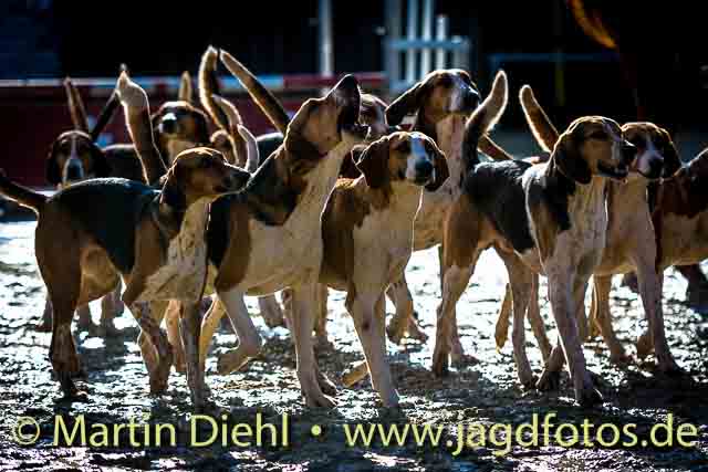 Am Hubertustag fand in Mannheim-Friedrichsfeld die Abschlussjagd der Hardt Meute statt. Ein weiterer Höhepunkt einer intensiven Jagdsaison im Jubiläumsjahr. Die Veranstaltung in Friedrichsfeld ist berühmt zum einen für die exzellente Bewirtung. Denn schon während des Stelldicheins halten Vereinsvorsitzender, "Chef de Cuisine" Michael Mühlbauer und seine Helfer immer wieder neue kulinarische Überraschungen bereit und zum anderen auf Grund der wunderschönen Jagdstrecke mit langen kurvenreichen Runs und vielen abwechslungsreichen Hindernissen quer durch den herbstlich bunten Friedrichsfelder Forst. Organisator Rainer Forschner und sein Team hatten für den top Zustand der über 30 Hindernisse und für vorzügliche Bodenverhältnisse auf der Jagdstrecke gesorgt. Hier kann man bei jedem Wetter reiten. Trotz widriger Wettervorhersagen sammelten sich über 60 Reiter zum Stelldichein. Viele neue Gesichter konnte man sehen und es war eine Freude wie viele junge Reiter teilnahmen. Die jüngste Teilnehmerin, gerade mal 10 Jahre alt, kam mit ihrer Familie und einer Gruppe Jagdreiter vom Vollblutgestüt Westerberg, Ingelheim der Familie Rodde/von Opel und berichtete stolz, dass dies bereits ihre 3. Jagd sei. Ehrengast der Equipage war Dr. Dr. Wolfhard Lindner, Kronberg, der es genoss direkt hinter den schnellen Anglo-Francais zu reiten. Während des vorausgegangen Gottesdienstes riss der Himmel auf und die Sonne kam hervor. Vor dem Abritt begrüßte Rainer Forschner die Gäste aus nah und fern, dabei besonders einen Austauschschüler aus Australien, der seine 2. Jagd hinter der Hardt Meute bestritt. Dann ging es los zu den Hörnerklängen der Badischen Parforcehornbläser und die debütierende Schleppenlegerin Sandra Schwand machte ihre Sache hervorragend - schnell und zackig legte sie die Schleppe mit Andrea Wiehn und die Hunde schafften es nie, sie dabei einzuholen. ![]() Die ersten Schleppen waren nur mit einigen Hindernissen gespickt. Aber die Reiter hatten alle Mühe dem hohen Tempo der Tricolour zu folgen. Dann ging es auf die dritte Schleppe: vom Wald hinaus auf die Felder über 2 Hindernisse und wieder mit einer Spitzkehre in den Wald. Die Hunde verloren kurz den Scent, wurden neu angelegt und rasten weiter. Linksrum, rechtsrum, Hindernis und schon wieder um eine Kurve, der Boden griffig, im schnellen Galopp. Atemlos kam man zum Schleppenende. Nach einer kurzen Pause zum Tränken der Hunde kam ein langer Run auf sandigen, verschlungenen Waldwegen mit herrlichen Hindernissen. Der Regen hatte gute Arbeit getan, kein bisschen Staub, anders als im August bei der Jubiläumsjagd als der Sandstaub die Sicht trübte. Mit dampfenden Pferden ging es im Schritt zurück zur Pause an die Reitanlage, in der Ferne strahlte ein Regenbogen. Die Stimmung war famos. Bestens versorgt waren nach kurzer Rast für Hunde, Pferde und Reiter noch 2 Schleppen zu absolvieren. Das 2. Feld mit Petra Kaschta an der Spitze folgte jetzt direkt der Equipage und ließ sich nicht abschütteln. Der Run war lang mit unterschiedlichsten Hindernissen, auf und ab, Graben, Pulvermannsgrab und schon wieder um die nächste Ecke und dann die berühmte Eisenbahn Steilkurve, erst gerade über die Schienen und direkt danach ca. 160 Grad links um, die Pferde lieben es sich hier voll in die Kurve zu legen und dabei noch zu beschleunigen, die Reiter weniger, aber der Boden hält. Die letzte Schleppe ging zurück zum Reitplatz auf kurvenreicher Strecke den Berg hinunter und schon hörte man die ersten Halali, Halali Rufe. Die Bläser spielten Jagd vorbei und Halali. Die Reiter wischten sich die Schweißtropfen von der Stirn und schüttelten sich die Hände. Dr. Lindner schaute auf die Uhr und war erstaunt, es ist exakt 14:30h. Kurze Ansprache, dann der Dank an die Hunde, die sich freudig auf ihren Pansen stürzten. Die Reiter erhielten einen Bruch, Jagdknopf und Bügeltrunk. Die treuen Pferde dampften und wurden belohnt. Unfallfrei ist diese Jagd zu Ende gegangen. Es war die letzte Jagd im Jahr für die Hardt Meute. Ein herrlicher Abschluss des Jubiläumsjahrs. Vielen Dank an die Veranstalter! ![]() ![]() ![]()