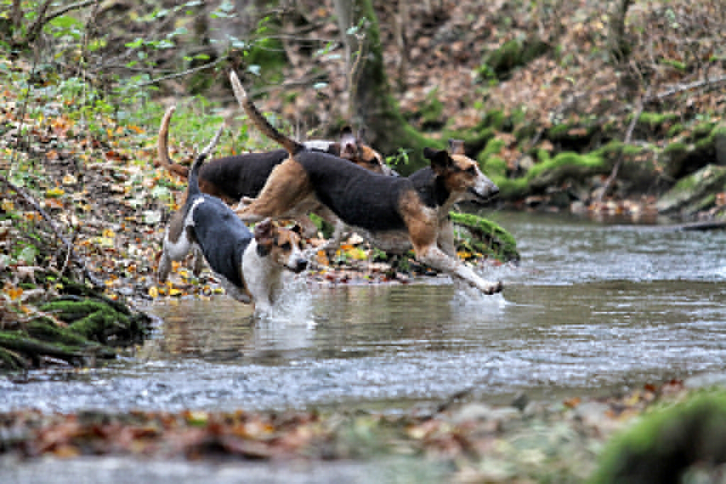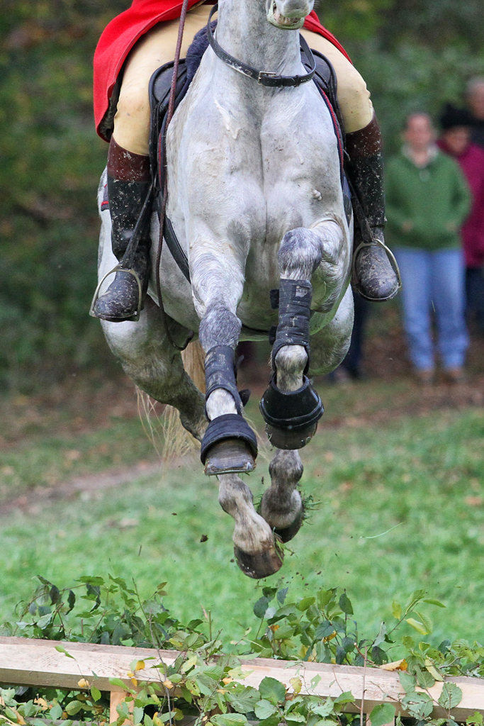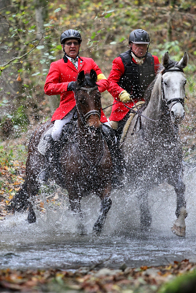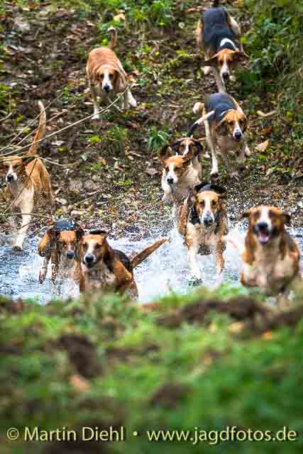 ![]() ![]() ![]() Endlich im Salltal angekommen geht es nach kurzem Sammeln schon auf die Schleppe über schön gebaute, breite Jagdhindernisse, die eine Freude sind, rein ins Wasser und wieder raus. Da mein Pferd Wasserdurchquerungen bisher nur im Schritt kannte, war ich sehr gespannt darauf, was es zu Galopp meint. Die vorigen Schleppen war sie noch etwas forsch, wobei sie ihren Job mit den Hunden sehr schnell begriffen hatte und dies schon gut meistert. Im gestreckten Galopp geht es dann tatsächlich hin und her durch den Fluss. Mit großen Sätzen zu Beginn, nimmt mein Pferd am Ende die Durchquerungen schon sehr routiniert. Ich glaube, wenn ich mich selbst beobachtet hätte, in welchem Tempo es direkt hinter den Hunden durch die Talschleppen geht, würde ich mich sicher für einen Kamikaze-Reiter halten. Aber dieses Gefühl ist herrlich, wenn man diese Schlangenlinien links/rechts, durchs Wasser, rauf, Sprung, wieder links, Wasser, rechts, Sprung, Sprung, Wasser ... reitet. Die Pferde werden aufmerksam, denken mit und haben richtig Spaß daran. Das Feld wird aber in etwas gemäßigtem Tempo hinterhergeführt und das mit Erfolg - kein Sturz oder Unfall geschieht. ![]() ![]() Kein Wunder, dass an vielen Stellen Menschentrauben stehen um dies Schauspiel mitzuerleben. Der Stopp an der Sallhütte hat schon Volksfestcharakter. Mit 3 Bussen werden die Zuschauer angekarrt. Und neben den Reitern wurden auch die Zuschauer bestens versorgt. Mit Kindern und vielen Hunden kommen sie, was die Arbeit mit den Meutehunden nicht immer einfach macht, aber schön, dass so viele Leute die Freude an der Schleppjagd teilen. Dann die letzen beiden Schleppen durch das Flusstal. Noch einmal mehrmals durch die Sall und dann zurück zum Ausgangspunkt. ![]() ![]() Das Feuer prasselt bereits, die Hunde bekommen ihren Pansen, Bruch und Jagdknopf werden verteilt. Beste Kulisse für Fotografen und Filmteams des SWR. Es war einfach genial. Wehmütig denke ich in diesem Moment daran, daß dies die letzte Jagd der Saison für mich gewesen ist. Aber ich komme auf jeden Fall wieder zur Schleppjagd nach Friedrichsruhe!! ![]() Berichterstatterin: Ulli Dressel ![]() ![]() ![]() ![]() |