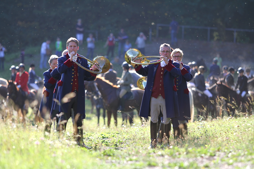 begleiteten die Jagd musikalisch mit Jagdsignalen.