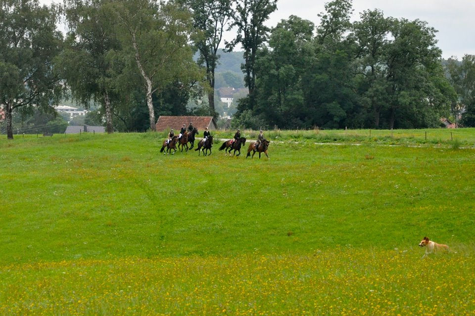 und Reiter eine Schleppe auf der grünen Wiese geritten. Gottseidank hatten die Hunde die beiden halbzahmen